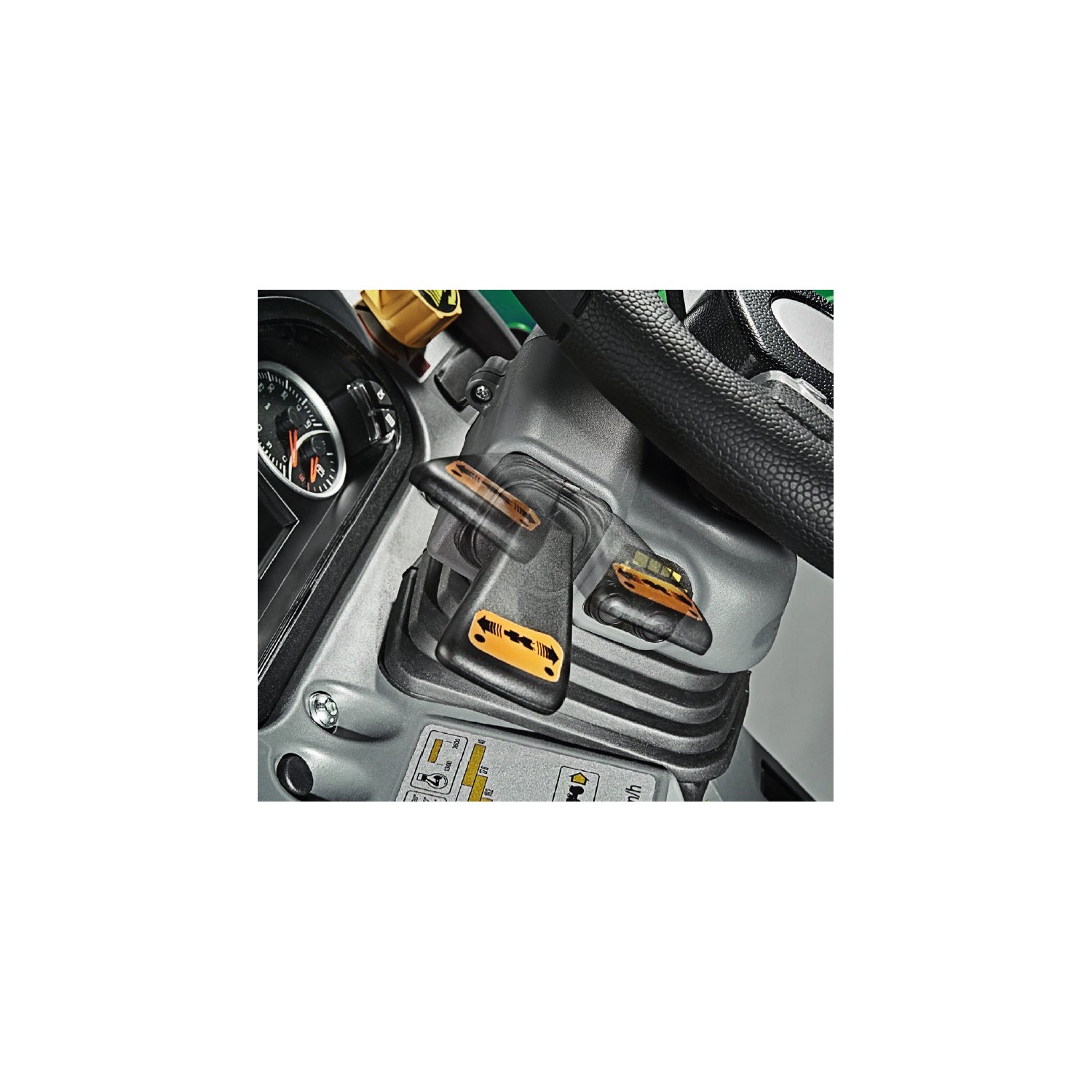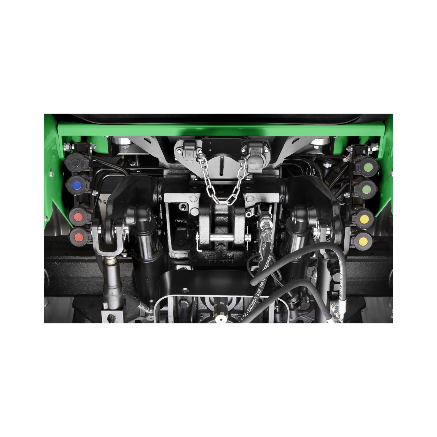 La desconexión de la tracción anterior, mediante un mando electrohidráulico, optimiza los trasferimiento por carretera además de preservar terrenos delicados o con mantos verdes.